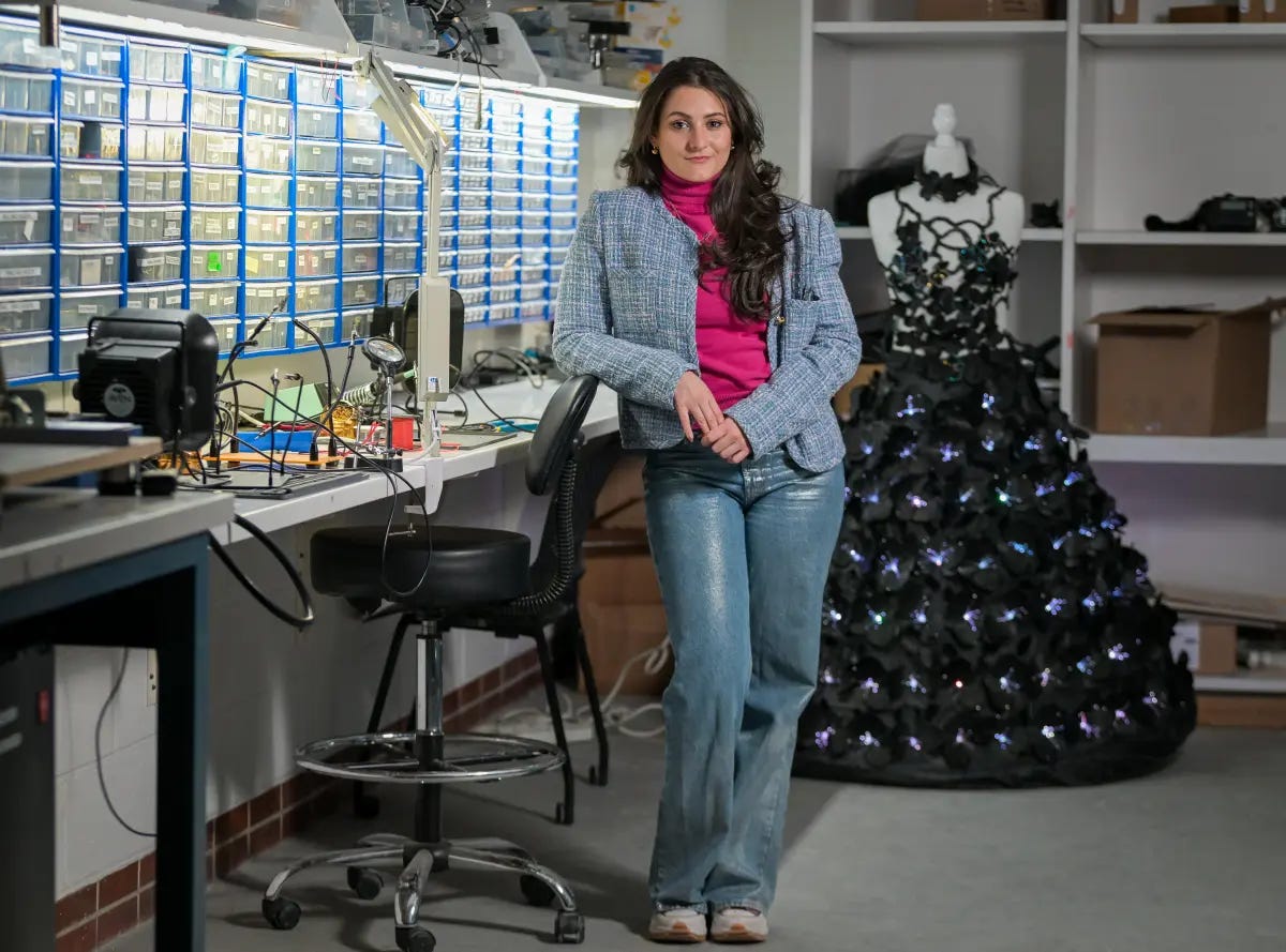 Robotics engineer and PhD researcher Anouk Wipprecht recently showcased interactive robotic garments at New York Fashion Week, highlighting the intersection between engineering, wearable robotics, and fashion design. One of the featured pieces, the “Blooming Dress,” uses embedded sensors and actuators to mechanically open like a flower when the wearer shakes someone’s hand. Another design incorporates optical fibres and stretch sensors that respond dynamically to body movement.